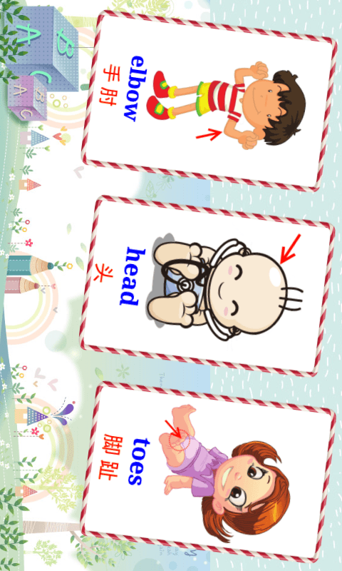 这是一个富含教育性质的互动学习卡,超过40张有趣的图片与声音,配合小游戏,帮助小朋友轻松认识自己的身体! ★ 请小朋友快来寻找线索解开所有的卡片喔!特点:★ 包含,脸部,手部,脚部总共40种常见的身体部位并且都加入了可爱的图片与中英文发音!★ 包含特殊的记忆模式从剪影(黑白卡)开始探索直到完成任务得到真实好看的卡片!★ 好玩的拼图游戏分为3种难易模式!您可以选择难度等级以满足每个孩子的需要!★ 中英文皆有真人发音,轻松学好英文词汇!★ 6种语言共通学习(英语/中文/日语/韩语/西班牙语/德语)!★ 可以训练孩子的认知,逻辑和语言能力。★ 拼图游戏都是随机产生的,是一个可以一玩再玩的教育游戏!★ 良好的操作环境同时适用于手机与平板![S02120212 C13]