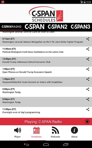 The C-SPAN Radio app delivers live audio streams of commercial-free public affairs programming (C-SPAN Radio, C-SPAN, C-SPAN2 and C-SPAN3) and audio podcasts of some of our regularly scheduled programs around the clock, wherever you are. \\r