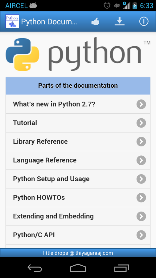 Full Offline Documentation for Python/* Clean Layout */Parts of the documentation*-- What's new in Python 2.7?*-- Python Tutorial*-- Python Library Reference*-- Python Language Reference*-- Python Setup and Usage*-- Python HOWTOs*-- Extending and Embedding*-- Python/C API*-- Installing Python Modules*-- Distributing Python Modules*-- FAQsIndices and tables*-- Python Global Module Index*-- Python General Index*-- Python Glossary*-- Complete Table of ContentsMeta information