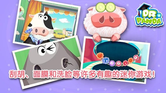 在我们倾力打造的熊猫博士美容沙龙里(适合 2 岁以上),化身时尚造型师在 11 款各具特色的迷你游戏中为可爱的小动物客人们完成指甲彩绘、项链定制和时尚造型等等创意设计吧!