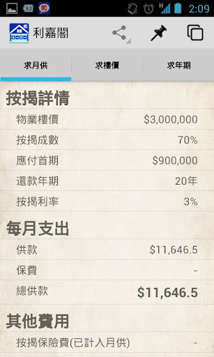利嘉阁‧按揭易 按揭计算机 简单方便地计算物业按揭如每月供款、*负担楼价和*短还款年期,供款详情和其他费用。 - 全新的界面,更方便使用,更与众不同的体验- 首创把按揭保费加到按揭总额内一拼计算的功能- 多种计算模式(求月供,楼价,年期)- 除了其基本的楼价找月供外,更可- 按月供能力找出*可买楼价- 按月供能力找出*短供款年期- 可以保存计算结果,方便使用者比较及免去输入常用数字- 分享功能,可以把详细供款表以电邮分享给朋友\\r