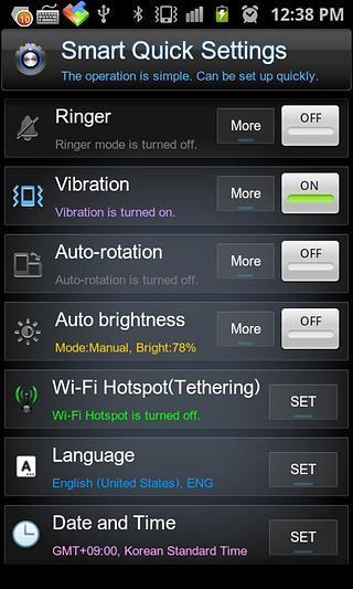 的操作是简单的。可以快速建立。 智能快速设置快速设置应用程序。操作简单,快速和容易地设置了 Android 框架。 ●智能快速设置的特点 ▷的 Wi-Fi 的 Wi-Fi,可以打开或关闭。 ▷移动数据移动数据(3G,LTE),可以打开或关闭。 ▷蓝牙蓝牙可以打开或关闭。 ▷GPSGPS 可以被打开或关闭。 ▷飞行模式飞行模式,可以打开或关闭。 ▷林格氏液(铃声)可以开启或关闭来电铃声。 (有声或无声) ▷振动设置振动或声音可以被打开或关闭。 (振动或声音) ▷屏幕自动旋转自动旋转屏幕或,固定屏幕可以打开或关闭。 ▷屏幕自动亮度亮度可手动设置或自动设置屏幕亮度。 ▷Wi-Fi 热点(圈养)便携式 Wi-Fi 热点,可以打开或关闭。 ▷语言在不同的语言,可以很容易地改变。 ▷日期和时间您可以更改自动与时间服务器同步,改变世界协调时间,日期/时间格式,如改变 ▷背景您可以更改待机屏幕墙纸或背景壁纸(目前) ▷电池信息示出了电池的充电速度和电池的温度。显示设备时,充电,充电信息。 ▷任务管理运行 Android 任务管理器 ▷应用程序管理运行 Android 应用程序管理器 ▷文件管理运行 Android 文件管理器 ●设置 设置状态栏 背景主题设置 ●主屏幕小部件 准备。 Android 平台 2.1(埃克莱尔)支持 Android 平台 2.2(升级 Froyo)的支持 Android 平台 2.3(姜饼)的支持 Android 平台的 2.3.3 支持 Android 平台 3.0(蜂窝)的支持 Android 平台 3.1 支持 Android 平台 4.0(冰淇淋三明治)的支持 Android 平台 4.1(软糖)的支持
