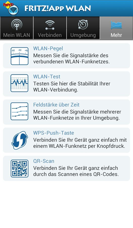 Mit FRITZ!App WLAN haben Sie Ihr WLAN immer fest im Blick. Nutzen Sie die FRITZ!WLAN App, um Ihr Android Smartphone oder Tablet komfortabel mit dem WLAN Ihrer FRITZ!Box oder einem beliebigen anderen WLAN Router zu verbinden. Darüber hinaus versorgt Sie FRITZ!App WLAN mit nützlichen Details zur bestehenden WLAN-Verbindung. Mit einer grafischen Ansicht schafft FRITZ!App WLAN zusätzlich Transparenz bei der Kanalbelegung der verschiedenen Gegenstellen in Ihrer WLAN-Umgebung.