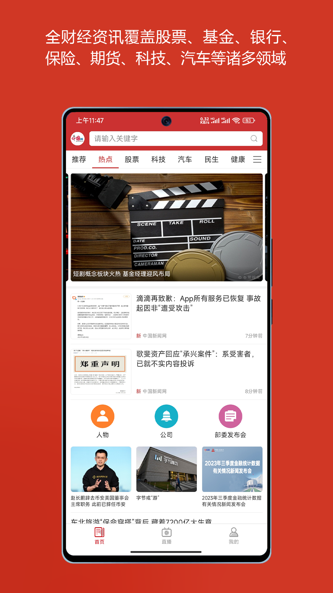 中国财经 APP 是一款集财经资讯、直播为一体的综合移动端产品,内容覆盖股票、基金、期货、债券、外汇、银行、保险、科技、汽车等诸多领域。