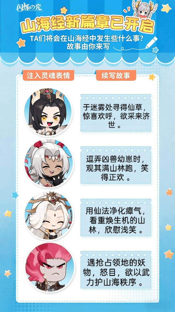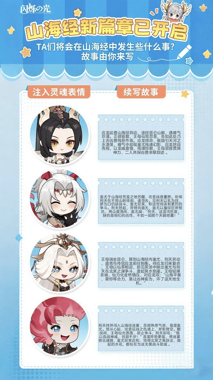 玩家唯你入眸为山海经新篇章的四位角色设计了专属 “灵魂表情”,把每个角色的性格都拿捏得死死的!角色的鲜活感直接溢出!