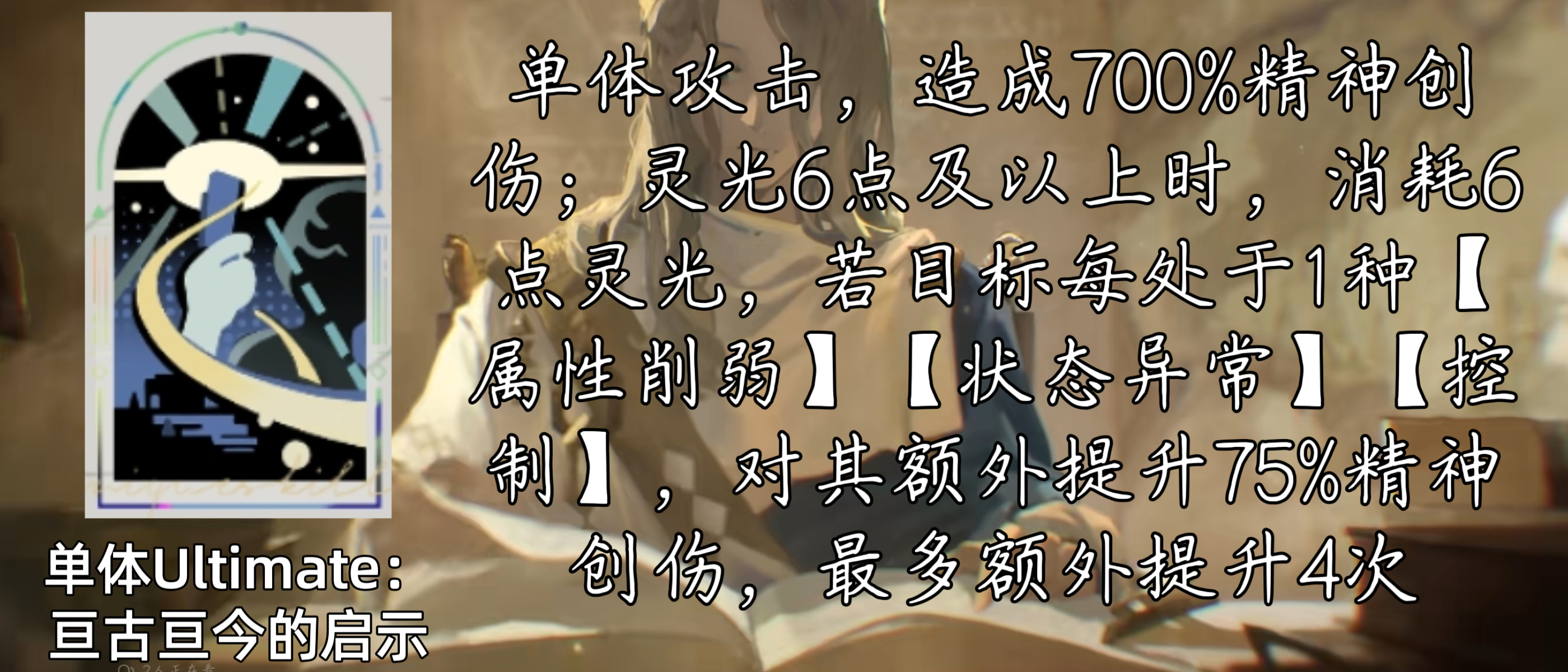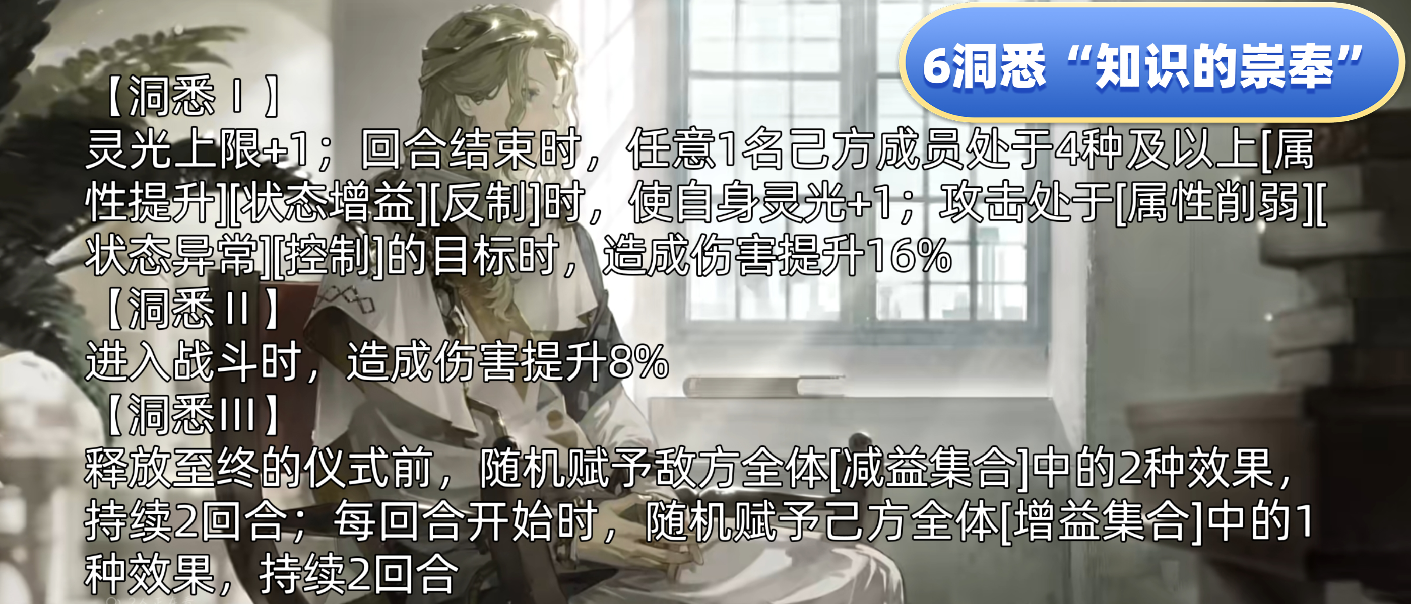 洞一后可以满足 0 塑状态下的至终仪式升伤条件(未洞悉前是上限 5 灵光),但 6 灵光还是要有点方法才能满。同时,单个角色有四种不同增益的情况下,可以让 6 灵光+1,这就让满灵光变得稍微容易一些了(但注意不要在 5 的时候放 buff 卡,会变成使用 5 灵光获得咒语强化Ⅰ)。最后就是在攻击前要挂好 debuff,这样可以有效增伤(这个效果是为至终仪式服务的)。
