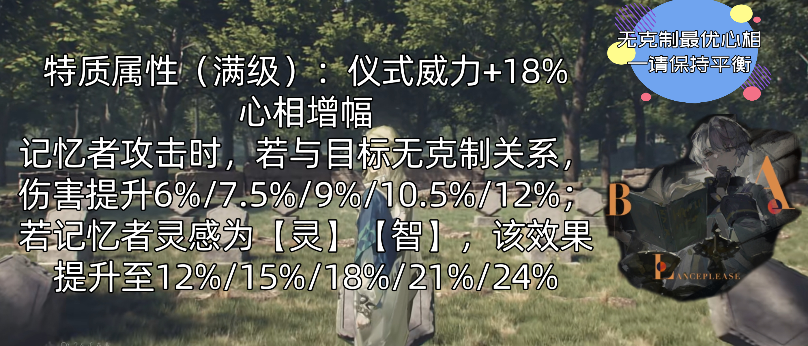 因为无克制,那么对于灵和智角色可以造成的伤害提升幅度更大,针对 6 这个角色就可以打出更高的伤害。同时特质属性可以增加仪式(至终仪式)威力,进一步增加 6 的输出能力。但如果是带克制的情况下,这个心相就完全没这个优势了。接下来,就要换成另一个心相了。