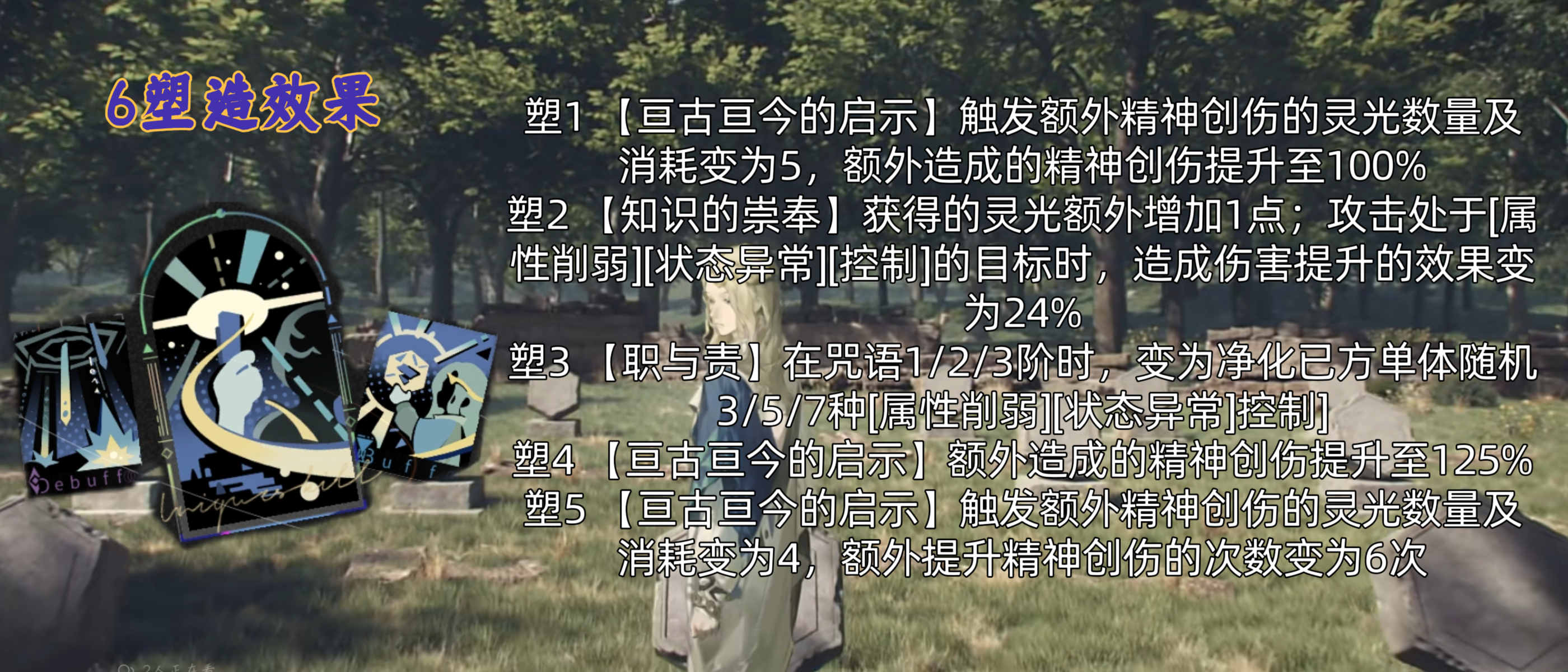 塑 2 提高单角色 4 种不同 buff 获取的灵光数量(未获得前为 1 点,获得后为 2 点),攻击有 debuff 的敌方时额外伤害由 16%增加到 24%。