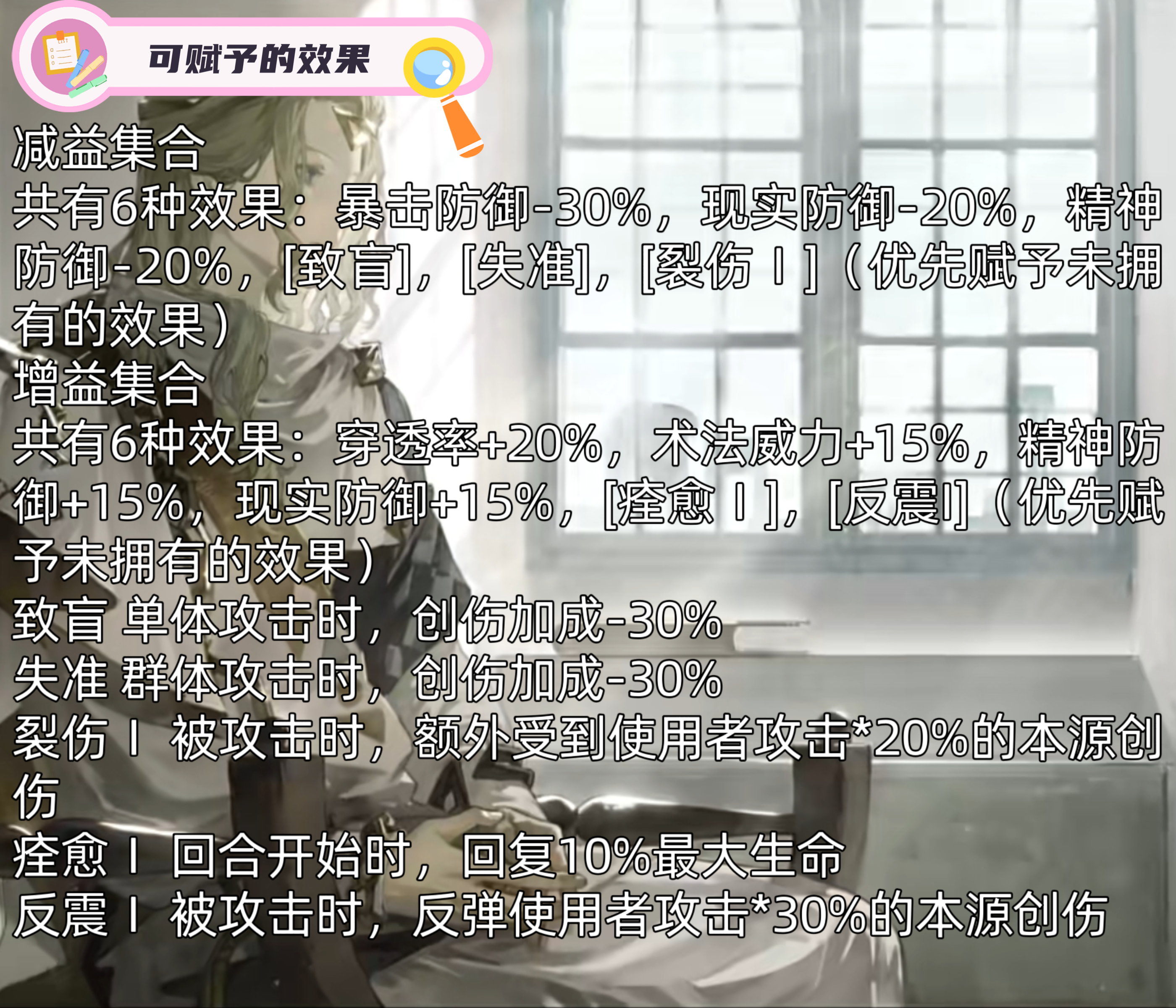debuff:三个减防,算是很常规的(但不能和一些可以赋予相同类型的角色一起用);两个创伤加成减少,这个对于一些较低等级的角色有很大帮助(不容易被打死了);最后那个可以认为是附加伤害,相当于增伤