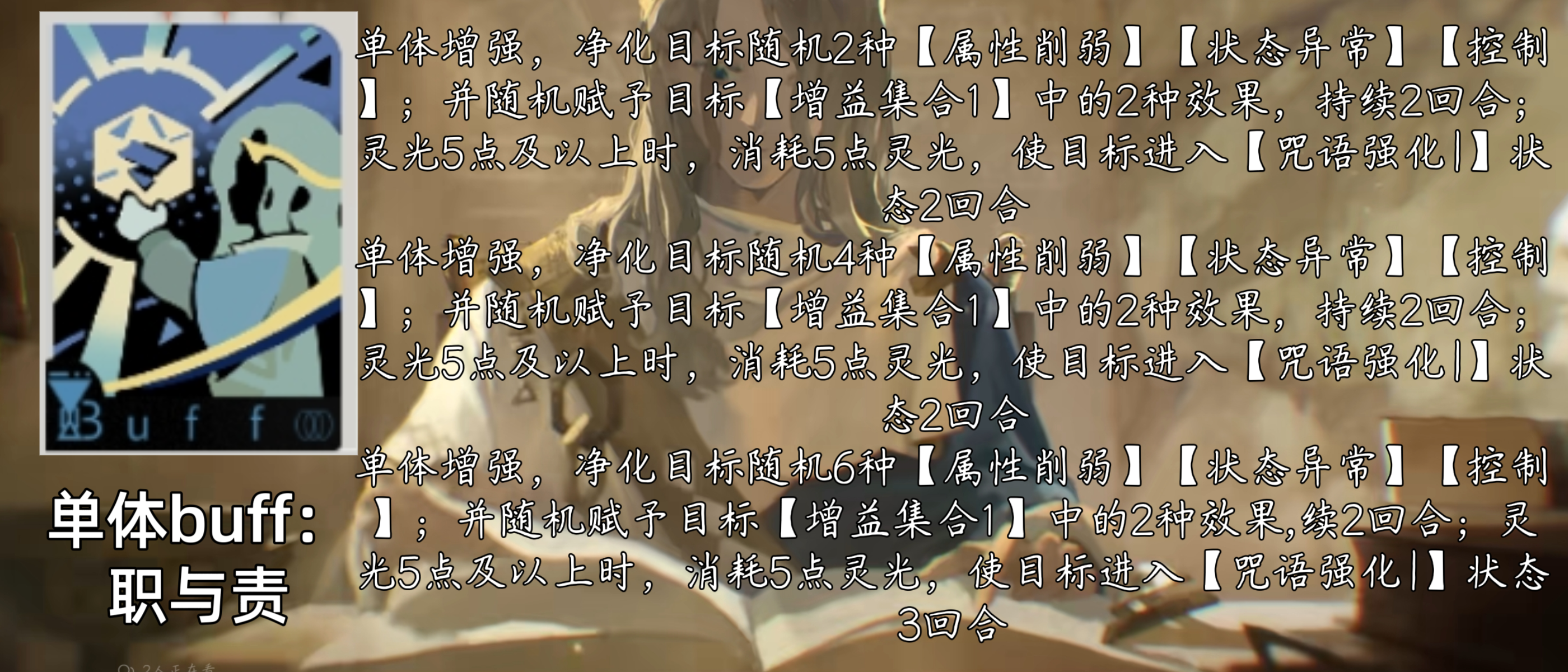 这个 buff 不是好在赋予 buff 上,而是可以净化 buff!对于以前的鬃毛邮报里的海怪来说,一个 6 一个牙仙,海怪的冰冻就很容易被解开了。还有那些减防、减伤的 debuff,被净化了就会非常地爽。但在一些角色要开至终仪式之前丢一个 buff,只是单纯想给个加伤害的,万一刷到了岂不是爽哉!但如果有的话就别乱用了,毕竟你的灵光最好是丢给至终仪式(咒语强化我个人觉得没什么用)