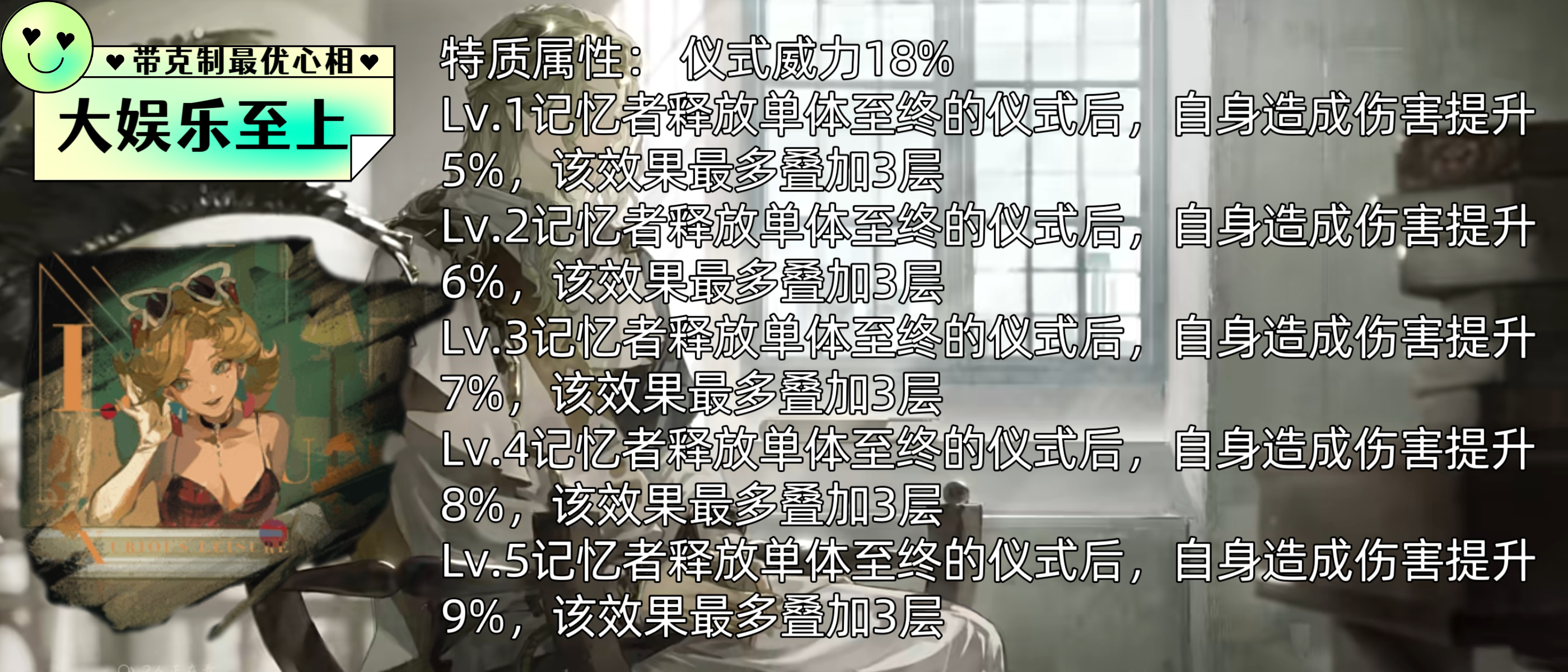 因为 6 本身伤害倍率比较低,同时我这边是用 debuff 的频率是高于 buff 的,所以没有选用“美丽新世界”,而是选用了增加至终仪式伤害的“大娱乐至上”。同时,这个适合长线作战的心相,可以给 6 增加伤害。但如果是不克制的情况下,还是得带“请保持平衡”