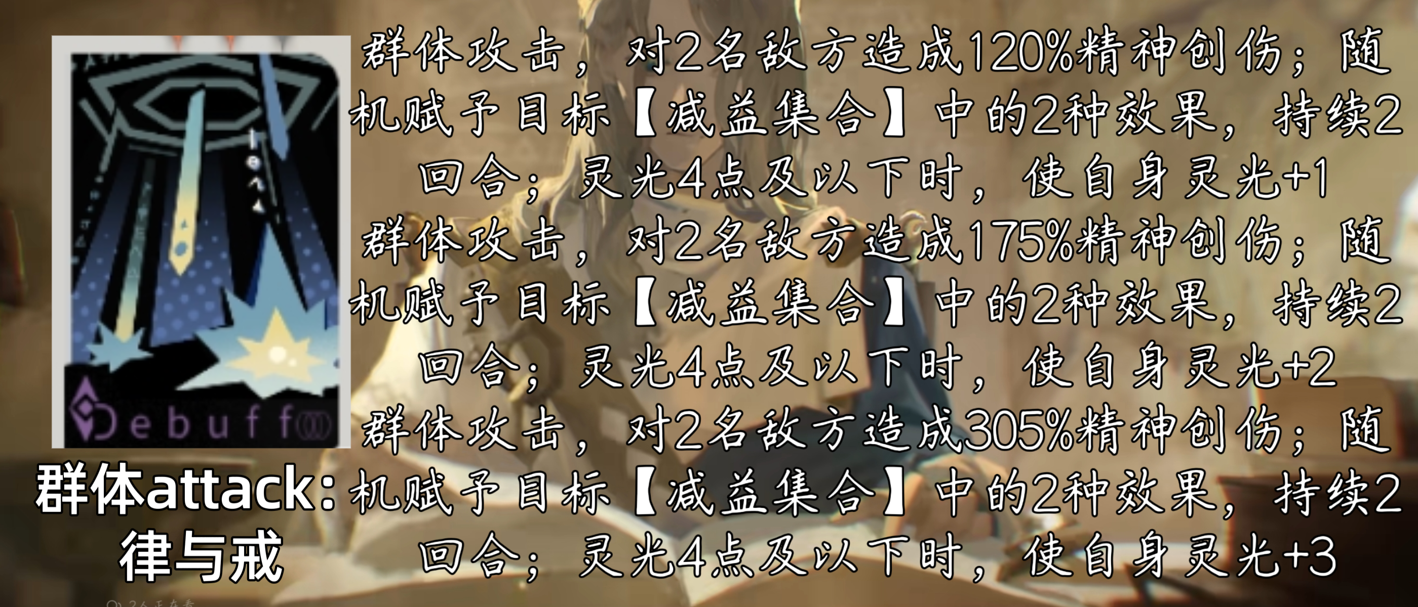 6 主要是在精神类主 c 放高阶卡或者是至终仪式前加一个 buff,很可能会增加主 c 的输出。同时,不能抢占主 c 的牌权,所以能不用就不用。但如果是敌方已经没有 debuff 了,那该挂的还是要挂上(最多占用一个行动点,其他的留给副 c 和主 c)