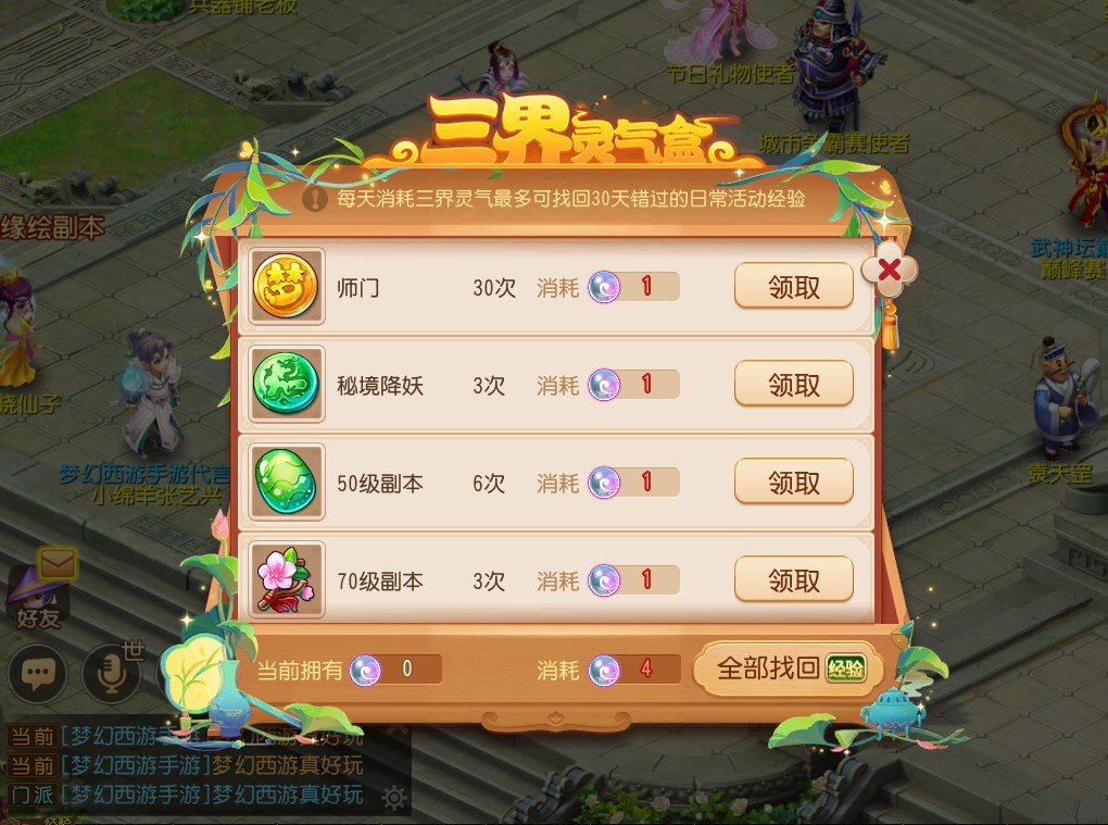 每日活跃度分别达到 60 和 100,可分别获得三界灵气,使用三界灵气可以找回往日错过的经验。(三界灵气可以相互赠送哦)