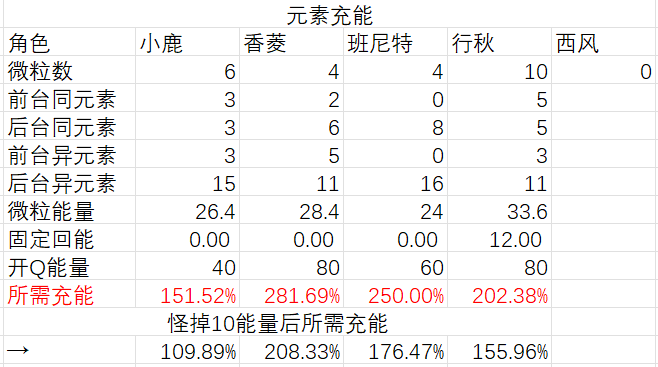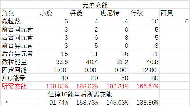 补充:如果没有香菱的西风,充能需求如下: