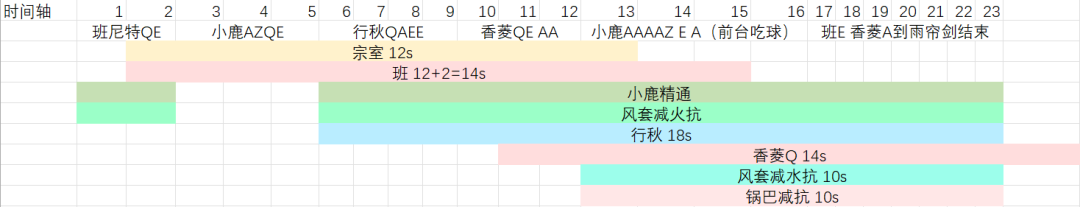8.然后就是国家队经典的班给香菱打球+香菱前台吃西风环节,轴长事实上最低是 22s,但以行秋雨剑消失作为标志的话,可操作性更强,所以我安排了 23s 轴。