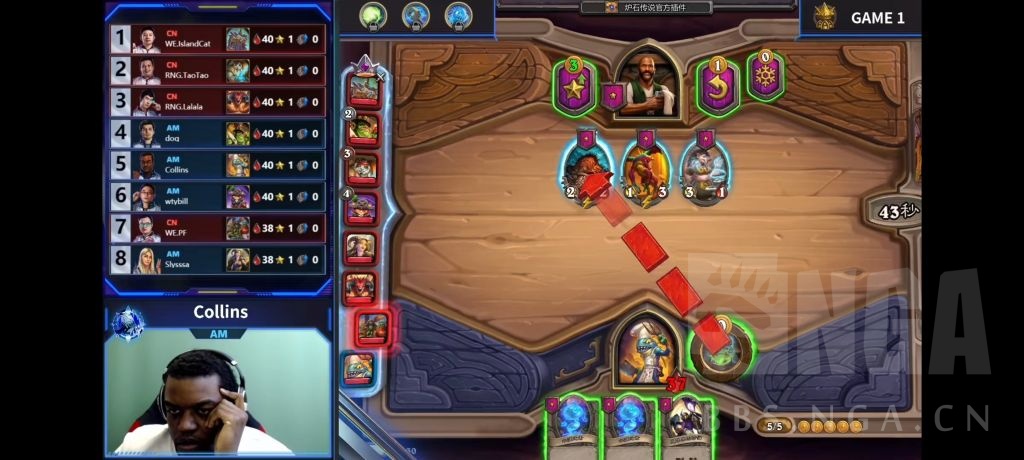 背景介绍:这是国际冠军杯决赛 AMvsCN 的第一场黑哥 Collins 的一本曲奇。黑哥这把的曲奇,在 8 费的时候完成了三对碰四的壮举,并最终拿到了第二名,让我们见识到了一本曲奇的可玩性。现在我们就来分析下黑哥在 5 费时候的这手抉择
