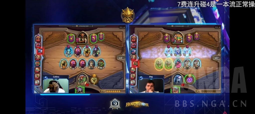 选手打法:上面的黑哥铜须 7 费回合首先选择购买了理财鱼和监工,做完任务获得铜须,此时还剩 1 块钱。然后选择监工 buff 小鬼,卖掉监工和一个 21 鱼,买小鬼 3 连正好把钱花光。同时将手上的铜须和理财鱼理财虎全部丢上场,获得 2 个衍生物的 3 连。此时黑哥总共获得 3 个 3 连,选择全部拿在手上不上,结束回合;而下面的狗哥,在 7 费回合手上拿着一个小粉的 3 连,同时酒馆还有 1 个 31 猪的 3 连。狗哥选择卖掉 1 个小鬼,用 8 块钱连升 2 本,丢出小粉的 3 连碰四,并锁住酒馆,结束回合