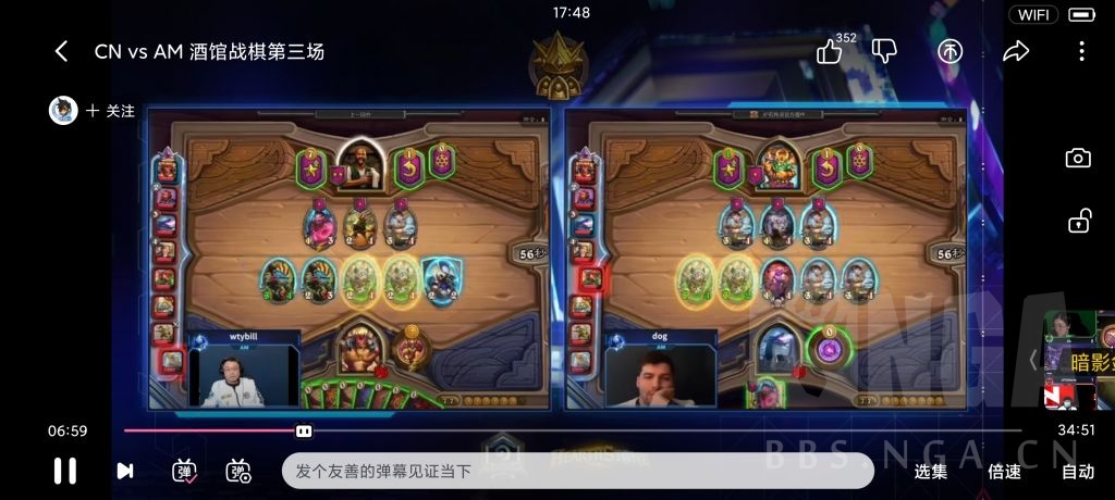 复盘分析:先看黑哥的铜须,对铜须来说,无论你是否选择一本道,如何做完任务才是你最优先要考虑的事。这里黑哥的运气不错,刚好刷出 2 个战吼,让他正好做完了任务。同时酒馆还刷出了一个 3 连,手上还能通过铜须获得 2 个衍生物的 3 连。但是由于要做完任务,这回合黑哥的经济无法支持他再进行升本,而 3 连碰三并不是目标,自己的血量也比较健康,所以黑哥选择了比较激进的打法,完成 3 个 3 连并且选择不下,卖血来换取下回合碰三个四本怪,博取更大的收益;再看狗哥这边,卖小鬼连升 2 本,思路非常清晰,就是要碰四本,三本除了二王其他怪的收益完全不如四本。同时锁住酒馆的 3 连,下回合继续碰四,将三连碰四的思路贯彻到底