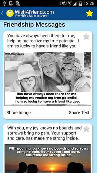 Stay in touch with friends by sending friendship quotes, messages, images and pictures to your friends. Share love via Whatsapp, Facebook, Email, etc. Send pictures and images with friendship quotes in a jiffy. \\rIf you believe that friendship is all about sharing and expressing your thoughts, then this app is just for you. You can even tickle your friends\' funny bone with humorous friendship messages. \\rSend Friendship messages and quotes to your friends/family. Send via text, sms, Whatsapp or other chat apps like Wechat, Line, etc. Or share on Facebook, Twitter or email them. \\rYou could also save and use them as friendship wallpapers. \\r 通过发送友谊报价,消息,照片和图片给你的朋友与朋友保持联系。通过 WhatsApp 的,脸谱,电子邮件等分享爱情发送照片和图像,友谊报价在一个瞬间。 \\r 如果您认为友谊是所有关于分享和表达您的想法,那么这个程序是只为你。你甚至可以胳肢你的朋友“滑稽骨幽默友谊的信息。 \\r 发送友好的消息和报价给你的朋友/家人。通过文字,短信,WhatsApp 的或类似微信,行等其他聊天应用程序或共享发送到 Facebook,Twitter 或通过电子邮件发送。 \\r 您还可以保存和使用它们的友谊壁纸。
