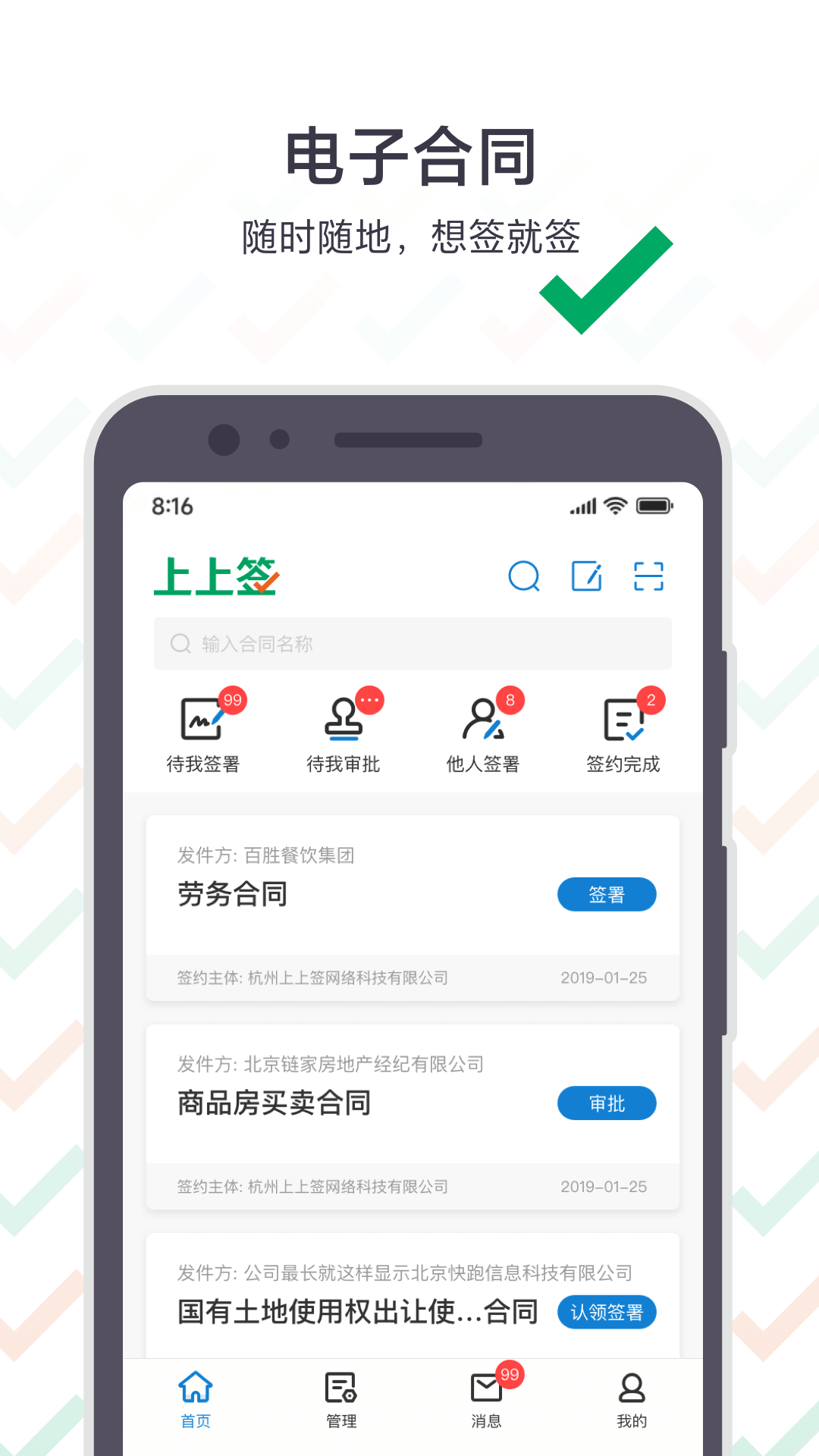 \\t 支持移动设备完成文档签署,脱离场所限制,随时随地,想签就签。