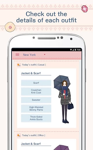 Oshare weather suggests outfits to match your taste from many different variations across four fashion styles: feminine, natural, office, and fashion.\\r