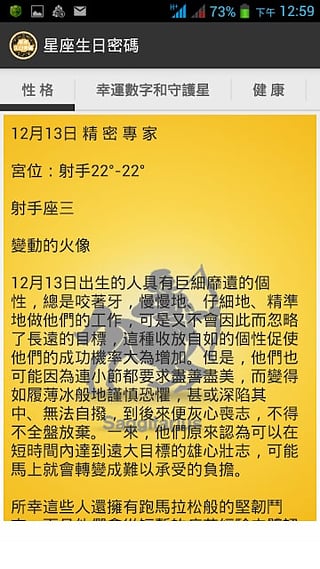 现在位置: 首页 / 安卓 / 待更新 / 正文 星座生日密碼 ONE.一个APP 安卓 3小时前 ⏳ 已提交(11-21 07:23) 2 ℃ 0 评论 摘要 查询自己的生日密码,性格、幸运数字和守护星等资讯。 星座生日密碼海沙工作室备案号:待更新 安卓 《星座生日密碼》游戏 APP 是海沙工作室开发的安卓系统应用软件,版本号:1.5,由丢塔游戏网整理,欢迎下载体验。 每个人的生日都是一个迷,不同的生日都会有不同的命运。通过星座生日密码解密可以方便地查询自己的生日密码,包括性格、幸运数字和守护星、健康、建议、名人、塔罗牌、静思语、优点和缺点等。 《星座生日密碼》公司开发 海沙工作室 《星座生日密碼》软件版本 1.5