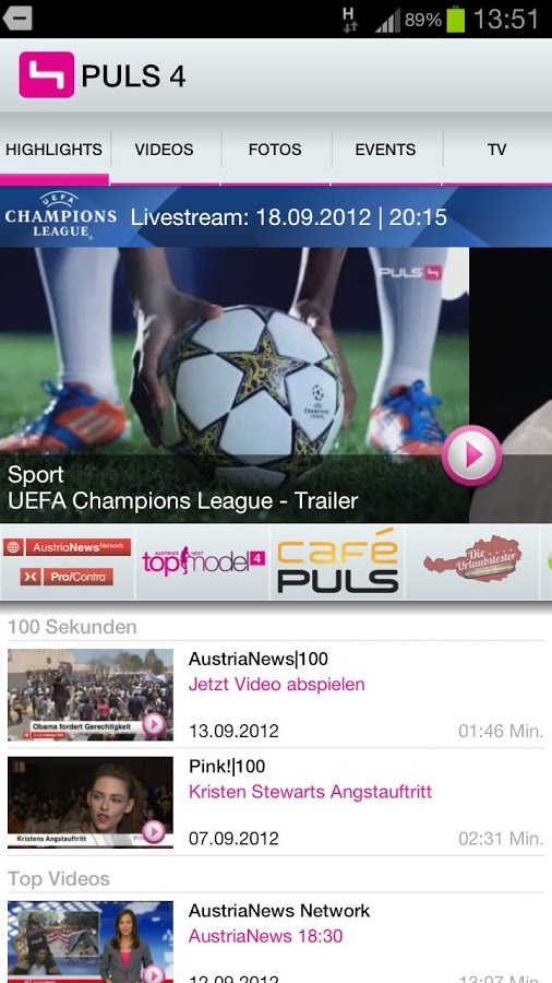 PULS 4 - Immer bei mir! PULS 4 bringt dir deine Lieblingssendungen direkt auf dein Android Smartphone – und das kostenlos, jederzeit und überall. Durchstöbere das PULS 4 TV-Programm, klicke dich durch die besten Partyfotos und entdecke die coolsten Event-Tipps. Fußball-Fans aufgepasst: Mit der PULS 4 App verpasst ihr kein Tor der Königsklasse im Klubfußball! Mit dem mobile Live-Stream der UEFA Champions League bleibst du bei den Besten am Ball! ★★★★★ „Super App. Echt viele Videos drauf und alles gratis. I like!“ ★★★★★ (User Review)Die Android App erreichte Platz 3 in der Kategorie Unterhaltung in Österreich!Die PULS 4 App erhielt eine Auszeichnung als \\\"Beste App eines Medien- bzw. Kommunikationsunternehmens\\\" in Europa beim 14. Internationalen Eyes & Ears Awards 2012! Du hast deine Lieblingssendung verpasst und willst sie unbedingt sehen?Die Zugreise nimmt kein Ende und der Blick aus dem Fenster ist auch schon fad?Du willst JETZT deine Sendung sehen unabhängig vom aktuellen TV-Programm?Du liegst in der Sonne und möchtest gut unterhalten werden?Du willst die UEFA Champions League ansehen und kein Fernseher ist in der Nähe?Die PULS 4 App ist genau die Abhilfe, auf die du gewartet hast!Verpasse nie wieder deine Lieblingssendungen!Neben PULS 4-Highlights wie die \\\"UEFA Champions League\\\" und \\\"Austria's next Topmodel\\\" kannst du Video-Clips von \\\"Café Puls\\