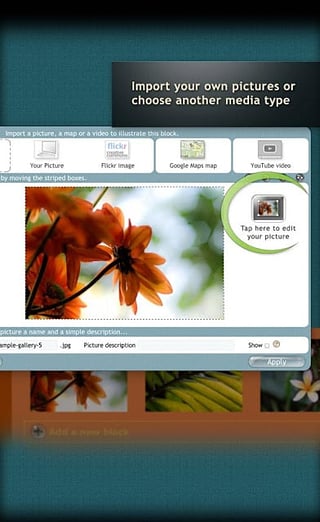 - 添加照片的 Flickr 图片,YouTube 视频,Facebook 和 Twitter 如按钮,谷歌地图...\\r