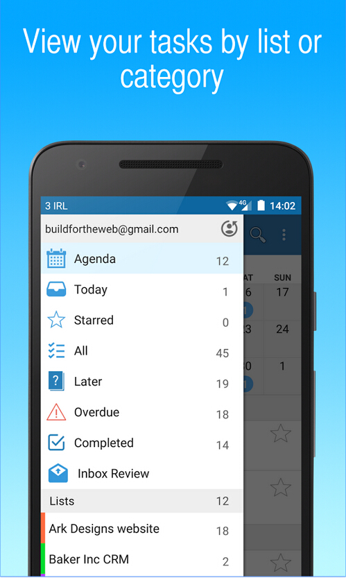 View your tasks and calendar events in the Agenda, or any of the predefined categories: Today, Starred, All, Later(no due date) or Completed. You can easily mark a task as complete or swipe it to postpone. Swipe left or right on the agenda week to move back or forth in time through your calendar.