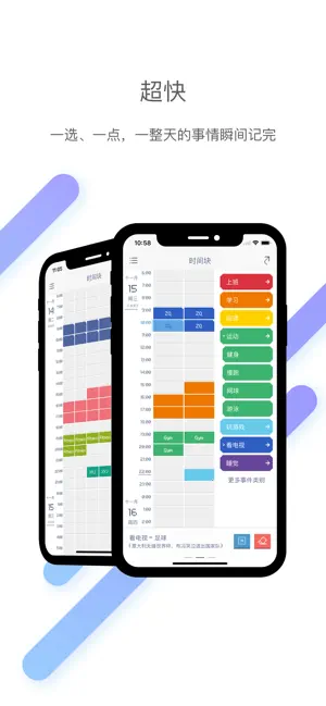 时间块与过去的传统时间记录 App 最大不同,就是它不用按“开始/结束”,数月的用户体验研究让我们最终化繁为简地做出了更符合人思维习惯的记时方式。不必再像以前那样时刻担心忘了开关记时,只需在闲瑕、小憩时花几秒钟,近乎玩游戏般地“一选,一点”,就能记下一整天想记的事。