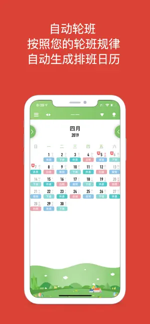 · 自动轮班——如果您是规律排班,比如护士等职业,仅需输入一次您的排班规律,排班日历即刻生成!