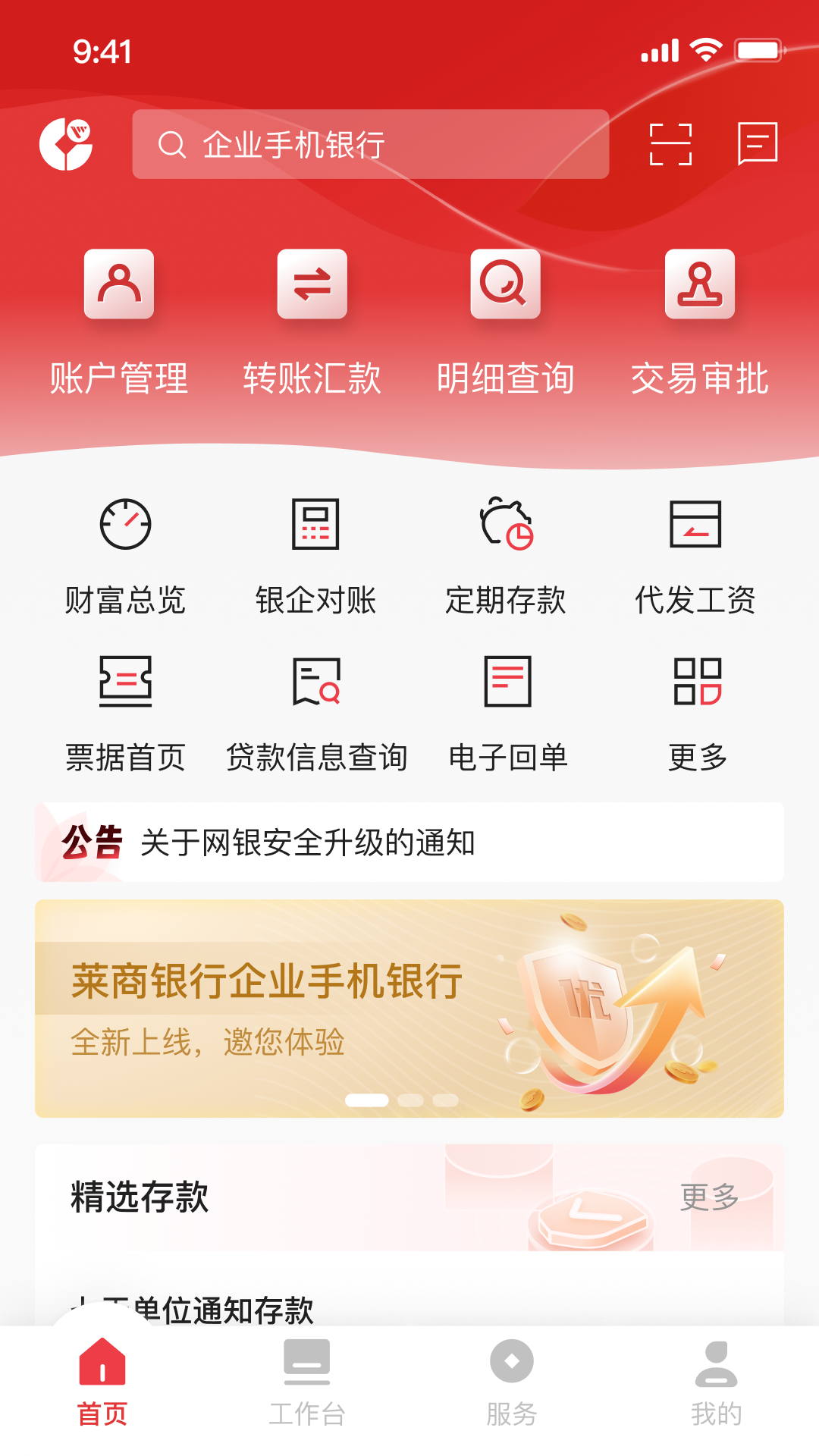 莱商银行企业版手机银行是基于莱商银行网上银行的相关功能,遵循企业网银相关业务规则、业务流程、审批机制而开发的新一代手机银行产品,实现了客户随时随地进行查询及授权的需求,更加方便、快捷的办理金融业务。
