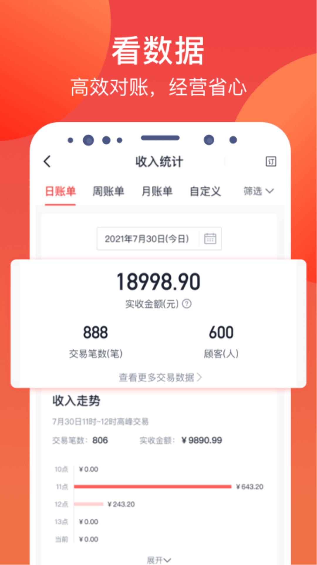 付呗是专门为商家量身打造的移动应用客户端,从此摆脱电脑的束缚。付呗实现随时随地掌上生意。从现在开始,让您随时随地地查看和管理账本,可在数据汇总模块中查看收入变化趋势。