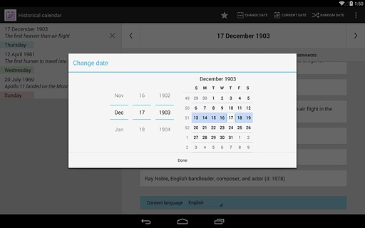 这个程序让你每天都在历史信息。该信息是从维基百科下载和特定于您的语言和文化。您还可以使用“历史上的今天”小工具,显示有关当前日期的信息。Problems with the translation? Please write me at historical.calendar@gmail.com