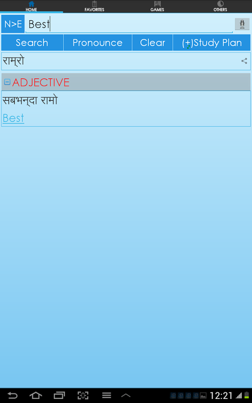 Nepali <> English Dictionary (100 % offline and free ). You can search both English and Nepali words.. This is not only a Dictionary but also a learning tool. You can use this dictionary when you have no internet connection. MCQ (Multiple Choice Question) option available. There is auto suggestion so you need not type full words. You also can use Speech to text feature . You can add words to study plan. And also you can remove words from study plan. You can turn on/off auto search going to setting of the app. So low profile Mobile handset can turn off Auto search to type quickly. You will see Dictionary icon on notification bar to start app quickly.Speciality- - No internet connection required - Built in Nepali Keyboard added for Nepali word searching - Auto-complete suggestions - Speech to text feature - Study plan section - MCQ (Multiple Choice Question)iPhone version below,https://itunes.apple.com/us/app/nepali-dictionary/id791096795?mt=8