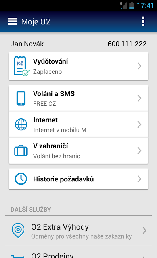 Ovládejte všechny své O2 služby on-line a mějte svá vyúčtování vždy po ruce. APLIKACE JE URČENA POUZE PRO NEFIREMNÍ ZÁKAZNÍKY!S aplikací Moje O2 pro chytré telefony budete mít přehled svých služeb a jejich nastavení vždy na dosah ruky. Stejně snadno, jako jste zvyklí z internetové samoobsluhy Moje O2 na počítači. Kdykoliv můžete zkontrolovat, kolik minut jste už provolali, kolik volných minut ještě zbývá nebo jak jste na tom s posíláním SMS. Stejně snadno získáte přehled o množství přenesených dat nebo změníte tarif. Kromě správy služeb získáte také přístup ke svým měsíčním vyúčtováním.Aplikace i její používání je zdarma, za data přenesená v rámci aplikace neplatíte a nepočítají se ani do limitu přenesených dat (FUP) u internetu v mobilu.Aplikace je určena pro zákazníky s mobilními hlasovými nebo datovými službami pro soukromé využití. Aplikace pro zákazníky z řad podnikatelů, firem a organizací veřejné správy prozatím není k dispozici.V APLIKACI MOJE O2 ZÍSKÁTE PŘEHLED O:- Volných a vyčerpaných minutách a SMS- Čerpání limitu přenesených dat (FUP)- Roamingovém tarifu- Vyúčtování- Doplňkových službách (balíčky, hlasová schránka...)NA ZÁKLADĚ VAŠICH PODNĚTŮ JSME USPÍŠILI DOPLNĚNÍ NOVÝCH FUNKCÍ:- Přihlášení prostřednictvím O2 ID (jméno a heslo pro www.mojeo2.cz)- Možnost trvalého přihlášení do aplikace prostřednictvím O2 ID- Zobrazení účtu s více SIM kartami (např. rodinní příslušníci)