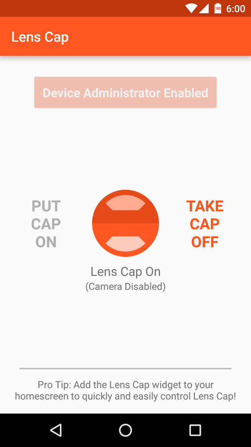 Lens Cap is a simple and modern app that disables your phone or tablet\'s camera.