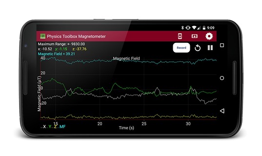 此应用程序的措施,并显示磁场(μT)与时间(s),可以导出在一封邮件。TXT 附件逗号分隔值(CSV)的图形。