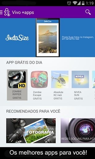 O Vivo +apps conta com uma seleção de apps escolhidos a dedo por experts no assunto para ajudar você a escolher os melhores apps. Quer encontrar apps que foram feitos para você?Quer saber quais apps os seus amigos estão baixando?Quer baixar os apps da Vivo? O Vivo +apps te mostra tudo isso e muito mais! Conecte com o Facebook para fazer a sua experiência social ficar ainda melhor! Receba recomendações de apps que tem tudo a ver com você.Basta escolher o seu perfil e o Vivo +apps sugere os melhores apps. Ele ainda possui um widget que pode ser instalado na tela inicial do seu aparelho, para que você tenha acesso rápido aos aplicativos da Vivo. + Jogos: Raciocínio, Ação e Aventura, Corrida, Luta e ++ Esporte e Saúde: Dieta, Futebol, Corrida, Brasileirão e ++ Informação e Educação: Revistas, Notícias, Cursos online e ++ Kids: Desenhos, Brincadeiras, Jogos para seu filho e ++ Fotos e Vídeos: Efeitos, Câmera, Edição, Filmes, Clipes e ++ Música e Cinema: Radio online, Filmes, Players e ++ Viagem e Turismo: Passagens, Lugares, Hotéis, Pontos Turísticos e ++ Produtividade e Finanças: Calculadora, Editor de Texto, Organização e ++ Estilo de Vida: Restaurantes, Receitas, Compras, Promoções e + Não fique de fora!