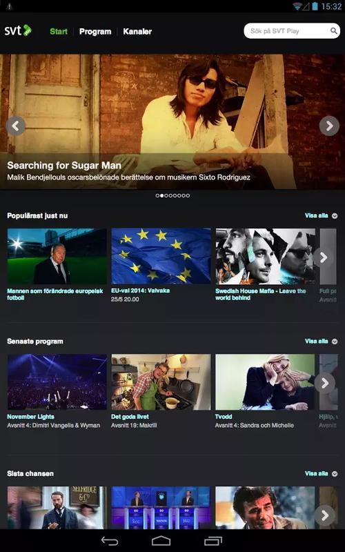 SVT Play för Android erbjuder SVT:s program när och där det passar dig bäst. Titta på ditt favoritprogram, klipp och livesändningar direkt i mobilen. Vårt mål är att visa samma utbud på samma sätt i din telefon och surfplatta som i din dator. SVT Play är fri television, även i mobiler och läsplattor.För bästa möjliga videokvalitet rekommenderar vi anslutning till SVT Play via trådlösa nätverk (Wi-Fi).Observera att detta är en betaversion och allting kanske inte fungerar perfekt. Feedback välkomnas i vårt supportforum: https://kundo.se/org/svt-play-beta-for-android