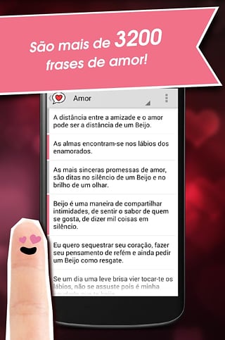 Conquiste seu amor com mais de 3200 frases romnticas! So 28 categorias para compartilhar nos principais chats: Facebook, WhatsApp, Viber, SMS e outros. Baixe agora no seu celular e comece a encantar alguém. Matéria no R7 - “Aplicativo ajuda romnticos de planto com frases de amor”: http://noticias.r7.com/tecnologia-e-ciencia/aplicativo-ajuda-romanticos-de-plantao-com-frases-de-amor-para-enviar-no-whatsapp-07042014 Matéria na Kzuka - “Aplicativo perfeito para quem está na fase de enviar mensagens fofinhas para agradar a paquera”: http://kzuka.clicrbs.com.br/geek-me/noticia/2014/04/aplicativo-reune-frases-romanticas-para-enviar-via-whatsapp-e-sms-4468046.htmlSendo bem sinceros no esperávamos que o app realmente pudesse ajudar tanto, mas veja alguns comentários que recebemos aqui no