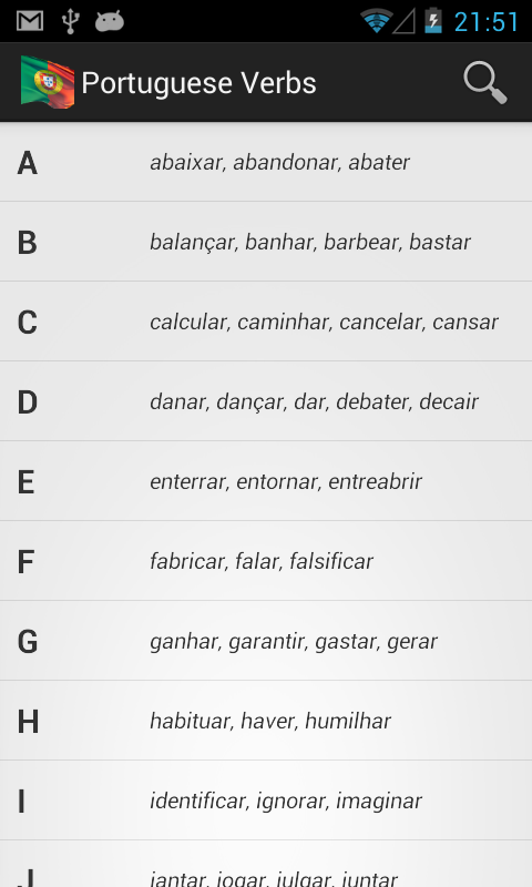View over 1000 Portuguese verbs in 18 tenses. With simple navigation and built in search, you can find the verb you need in seconds. Note: this app does not require an Internet connection. All of the data is stored locally.