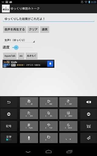 文本を入力するとその文本を読み上げるようなアプリなの。ファイル连携で音声をメールで连携もできるの。ゆっくりしていってねっ! ◇さわりの说明ゆっくりとか棒読みとかいわれる声で日本语を読み上げるアプリ ◇なにができるの?い.入力した文章の読み上げろ.読み上げる声の种类の设置(19种类)は.読み上げるスピードの设置に.読み上げる音程の设置ほ.棒読み音声ファイルの他アプリ连携へ.棒読み音声ファイルの保存と.棒読み音声ファイルの动画での保存◇どんな场合に使うの?い.声が出ない时の会话に。ろ.自分の口でいうのがはずかしい时に代わりに///は.さみしいときの暇つぶしのために、ひとりぼっちでおしゃべりに.ゆっくりかわいいよ、かわいいほ.その他、レビューで教えてください。◇ファイル保存の场所 Androidで音楽とか动画とかダウンロードのフォルダーがあるフォルダーにboyomi/というフォルダーが作成され、そのフォルダーに保存されます。音声ファイルは、 bym_ 年 _ 月日 _ 时分 _ 秒.wavというファイル名で保存されます。动画ファイルは、 boyomi.mp4というファイル名で保存され、ファイルが既にあるときは上书きされます。(棒読みをラインで使いたい场合は、一旦动画にして利用できると思います。)◇许可が必要なパーミッション①ネットワークへのフルアクセス 広告の表示と动画作成时に动画作成サーバへの接続のみに利用しています。②USB ストレージのコンテンツの変更または削除 ファイル连携时に音声ファイル(wav)の作成、音声ファイル(wav)・音声动画(mp4)の保存にのみ使用しています。◇音声合成ライブラリの著作権 本ソフトは(株)アクエストの音声合成ライブラリAquesTalkを使用しており、その著作権は同社に帰属します。営利目的での使用は该当ライブラリの使用ライセンスが必要となります。◇音声动画の保存についてLineで利用できるように、音声动画を作成できるようにしました。Line 内から动画を选択できると思います。ひとつ、制限がありまして动画作成时には音の长さの最大がが少し短めになってます。(动画作成时のサーバー负荷対策のため)