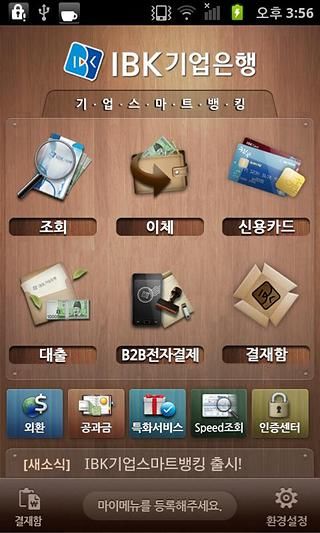 IBK,기업,기업은행,은행,뱅킹,스마트뱅킹,기업스마트,기업스마트뱅킹 1.서비스개요 IBK기업스마트뱅킹은 기업용 서비스로 기업전용 인터넷뱅킹 가입고객이 스마트기기에서 조회, 이체, 결재/승인 등의 기본적은 금융거래 뿐만 아니라 휴폐업사실조회 등 기업특화서비스를 이용할 수 있습니다. 2.서비스특징 쉽고 직관적으로 인터페이스와 기업의 중역사무실에서 업무를 보는듯 한 분위기 연출 ①이용대상 : 기업은행 기업전용인터넷뱅킹 가입고객 ②로그인 없이 계좌의 거래내역 및 잔액조회가능한 스피드 조회서비스 ③결재/승인, 조회, 이체, 공과금 납부 등 기본 금융거래 서비스 ④휴폐업사실조회 등 기업특화서비스 ⑤기업고객 특성상 안전한 금융거래를 위해 최초 신청은 가까운 지점을 방문하여 신청※ 기본금융거래서비스와 기업특화서비스는 지속적으로 추가 될 예정 3. 서비스종류 로그인/로그아웃 기능 SPEED 조회 *계좌조회 -거래내역조회 -펀드수익률조회 -외화거래내역조회 *환율조회 *펀드기준가조회 *금기준가조회 조회 *전체계좌조회 -예금 입출식 저축성 연금형 채권 -펀드/MMF 일반대출 한도대출 -외화계좌 외화보통 외화정기 외화당좌 -신용카드 *계좌상세조회 -거래내역조회(6개월) 예금/펀드 대출계좌 외화계좌 -수수료내역조회 *이체결과조회 이체 *즉시이체 *이체결과조회 신용카드 *이용내역조회 *청구서조회 -청구서조회 -청구예정내역조회 *이용한도조회 *신용카드조회/분실신고 대출 *대출계좌조회 *대출거래내역조회 B2B전자결제 *약정현황조회 결재함 *결재/실행대기 *결재/실행완료조회 *결재/실행등록조회 *결재선조회 외환 *환율조회 -환율조회 -환율변동추이 -선물환율조회 -환가료율조회 특화서비스 *국세청휴폐업사실조회 인증센터 *공인인증서 이용안내 *공인인증서복사 *공인인증서관리 *공인인증서갱신안내 환경설정 *새소식 *마이메뉴설정 *OTP 시간재설정 *OTP 사고신고 *이용자 비밀번호 변경 *버전확인 *캐쉬지우기