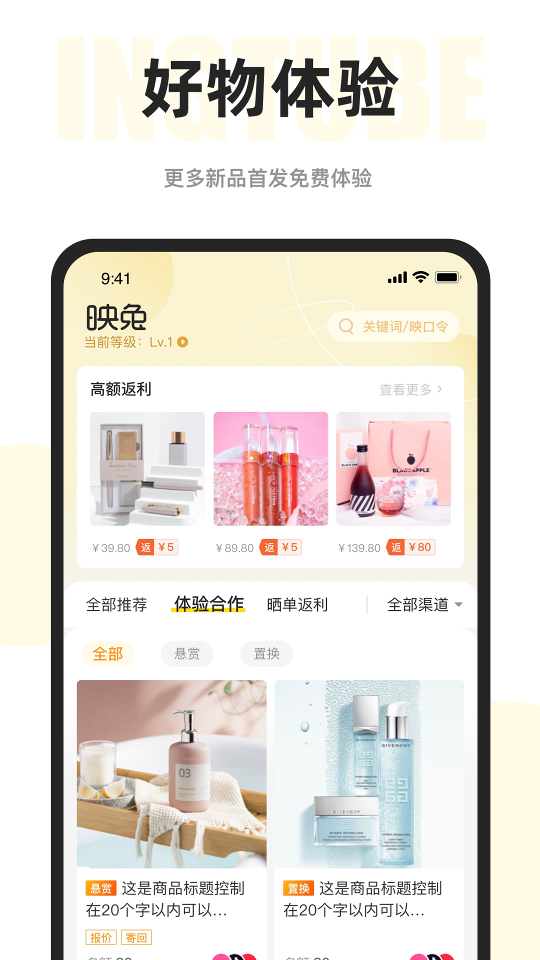 品牌不设限,口碑好物很重要,在消费中获得产品体验以及返利现金,可 0 元试用,全额返利喔~