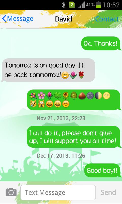 Important Note: Include Ads, you can remove it in pro version. all function are free now!It is an message app. Cool UI. It is very simple and easy to use. Feature: - Flat style and world cup UI - Support new emojis. - Popup message dialog, support more pages popup dialog. - Blink LED when new message arrived. - Support all emojis, you can send and receive emoji with friend. - More custom Bubble Theme support. - Internal snapshot support. - Custom notification icon. - Manage Sms messages conveniently.Future featues: - Go sms pro theme support. - Handcent sms theme support. - More custom features. like color/background/font. - ...