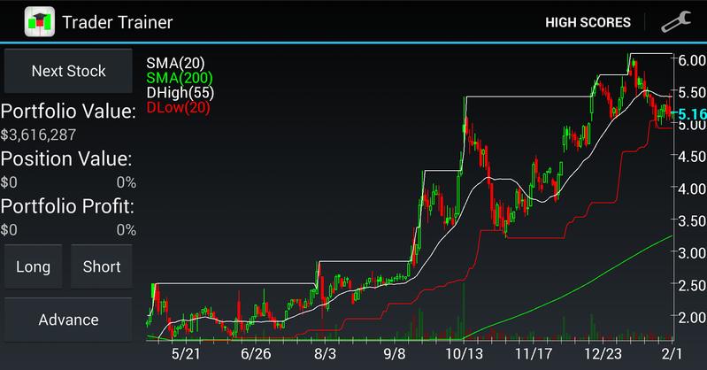 Trader Trainer loads anonymous stocks at a random times over the last 20 years. You choose and customize your own technical indicators (Simple Moving Average, Exponential Moving Average, Donchian High/Low, and Bollinger Bands) and choose an oscillator (RSI, Stochastics, MACD)Then start trading a fake $25,000 portfolio and see how high you can get it. Can you get it up to $100,000,000 and become a Guru Trader?Trader Trainer also 1) allows you to choose your position size for each trade and allows position pyramidding2) allows you to zoom in and out on the price chart with the swipe of one finger3) saves your progress so you don't have to start over every time you load the app.4) saves your highest scores (portfolio values while not in positions)Status levels:Beginner Trader: $25,000 Novice Trader: $100,000 Advanced Trader: $500,000 Professional Trader: $1,000,000 Master Trader: $10,000,000 Guru Trader: $100,000,000 Keywords: stock market game, trading simulator, investing simulator, finance game, virtual trading