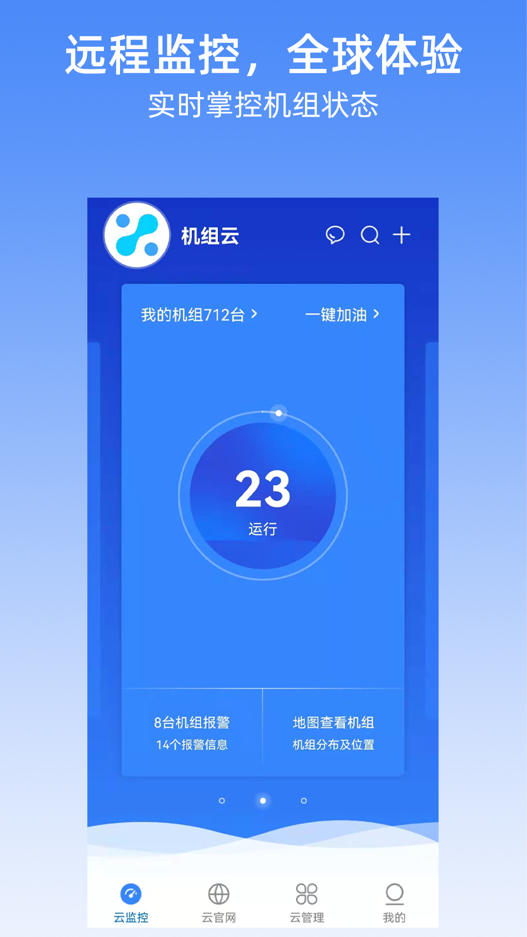 通过硬件采集器,将发电机组运行数据实时传输到机组云监控。用户使用机组云监控 APP,可实时查看发电机组运行状态、数据、报警、地理位置,并可对其进行远程操控。通过后台管理,对不同的用户授权不同的角色与权限,加强应用中发电机组数据的私密性。