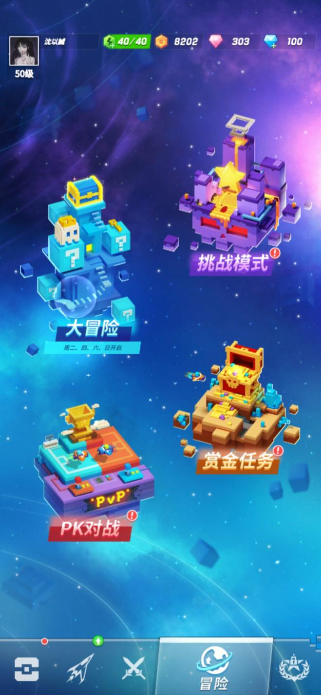 冒险界面是与主题关卡不同的玩法,分为大冒险、挑战模式、PK 对战、赏金任务,大家可以根据自己的兴趣和能力去挑战不同的关卡哦。