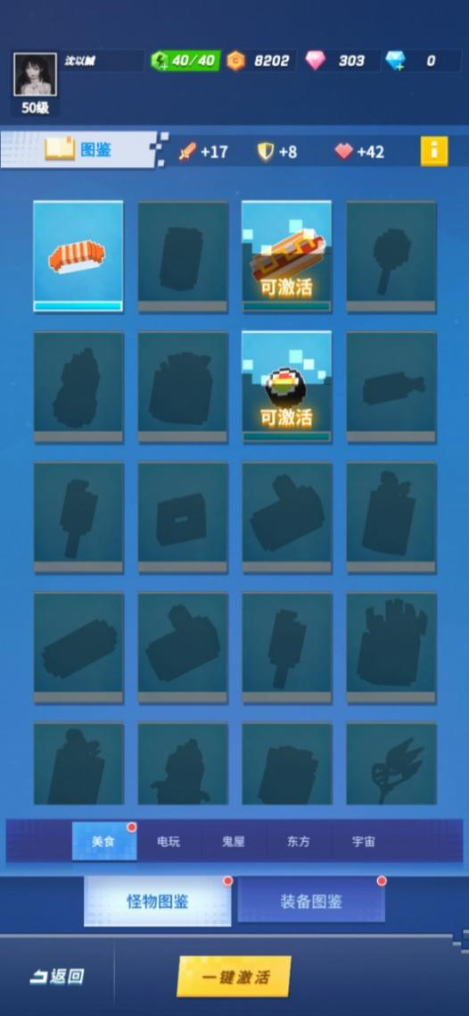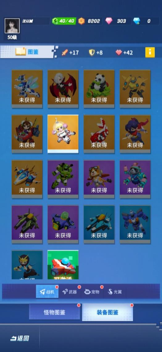 图鉴界面飞行员可以激活自己已有的图鉴,图鉴分为怪物图鉴和装备图鉴,其中怪物图鉴又按照关卡的章节分为美食、电玩、鬼屋、东方、宇宙,首次击败怪物可以激活对应怪物图鉴,击败一定数量的怪物后还可以升级图鉴,激活或升级图鉴可以提升对应怪物被击中时的伤害,所以要闯关成功后要及时来图鉴这里激活可爱的怪物们哦;
